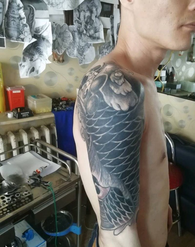 当前位置: 首页 >内蒙古包头市纹身店-包头金甲纹身纹身图案>强力遮盖鲤鱼纹身图片_传统动物手稿纹身图案