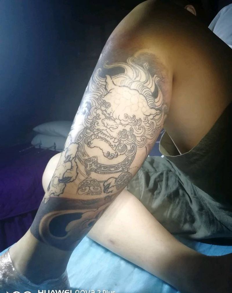当前位置: 首页 >内蒙古包头市纹身店-包头金甲纹身纹身图案>唐狮包小腿纹身图片_腿部纹身图案