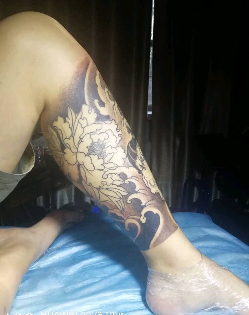 • T网红王老大花腿龙纹身图片_腿部新传统纹身图案