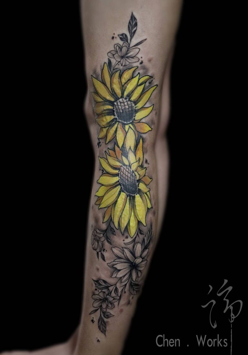 当前位置: 首页 >内蒙古赤峰市纹身店-谛 刺青纹身图案>向日葵纹身图片_腿部水彩向日葵疤痕遮盖彩色纹身图案