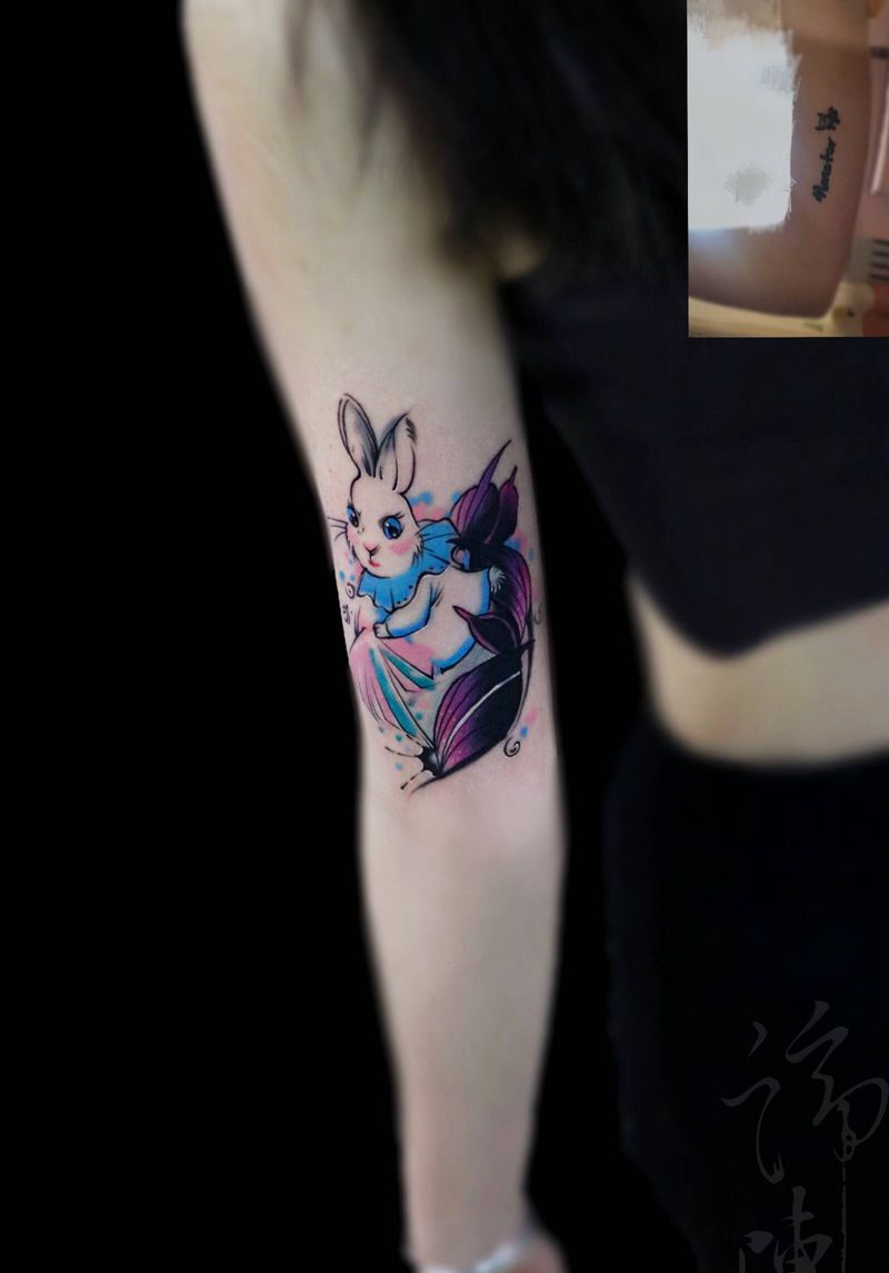 当前位置: 首页 >内蒙古赤峰市纹身店-谛 刺青纹身图案>小兔子纹身图片_手臂水彩兔子遮盖女孩子纹身图案