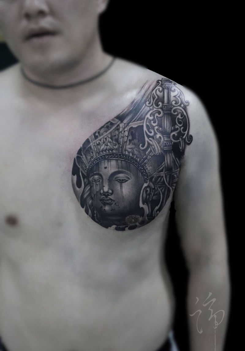 地藏王纹身图片_胸部老传统地藏王菩萨前胸纹身图案