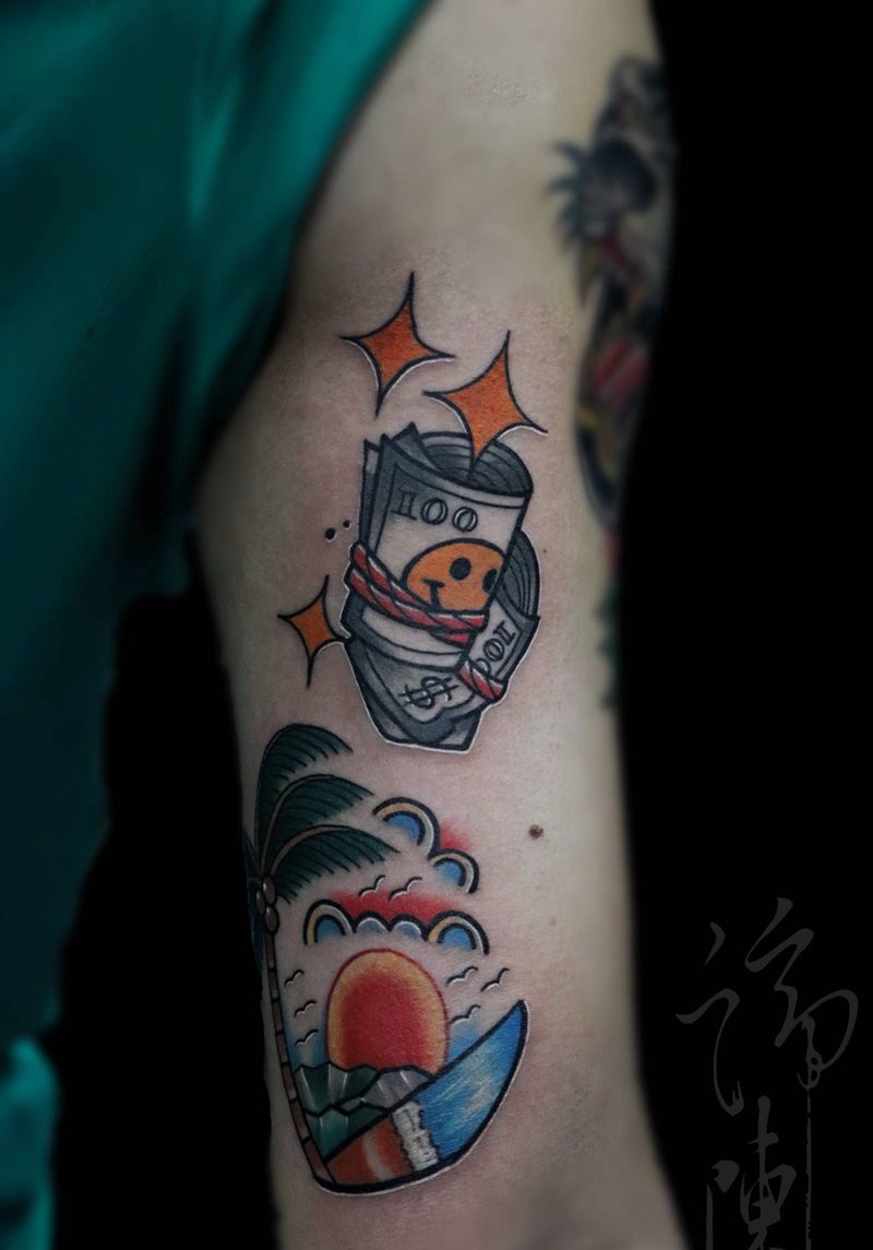 当前位置: 首页 >内蒙古赤峰市纹身店-谛 刺青纹身图案>Old school纹身图片_手臂Old School山水金钱Old school纹身图案
