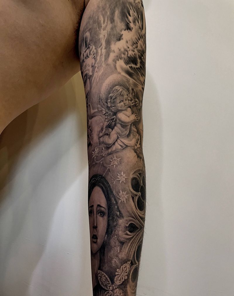 当前位置: 首页 >辽宁省沈阳市纹身店-也农刺青纹身图案>波塞冬窗格写实花臂纹身图片_手臂腿部欧美写实波塞冬圣母原创设计纹身图案