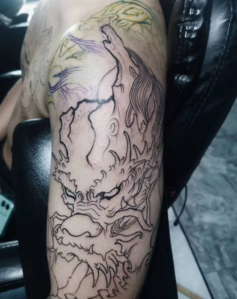 当前位置: 首页 >辽宁省沈阳市纹身店-文武刺青纹身图案>大臂龙头纹身图片_手臂新传统龙荷花水浪纹身图案