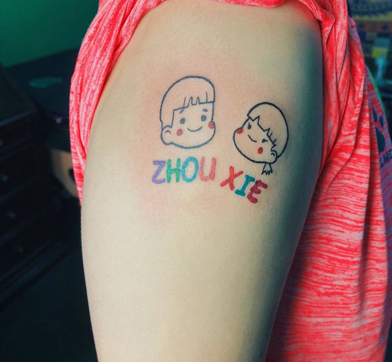 当前位置: 首页 >辽宁省大连市纹身店-方脸哪吒刺青纹身图案>男孩女孩纹身图片_手臂Old School男孩女孩可爱纹身图案