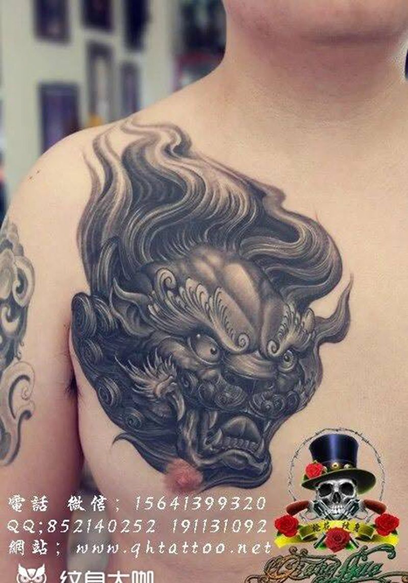 当前位置: 首页 >辽宁省抚顺市纹身店-枪花纹身机构纹身图案>唐狮子纹身图片_成品胸部传统动物纹身图案