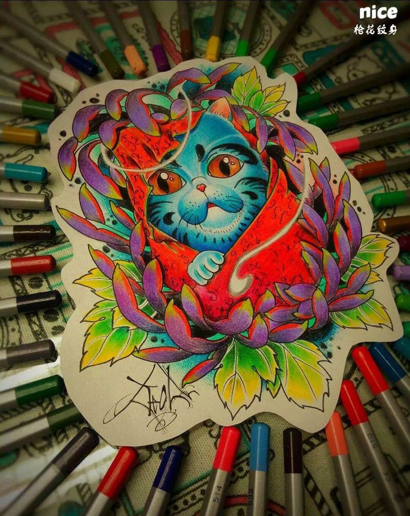 招财猫纹身图片_成品手稿肩部背部腿部清新宗教鬼神纹身图案