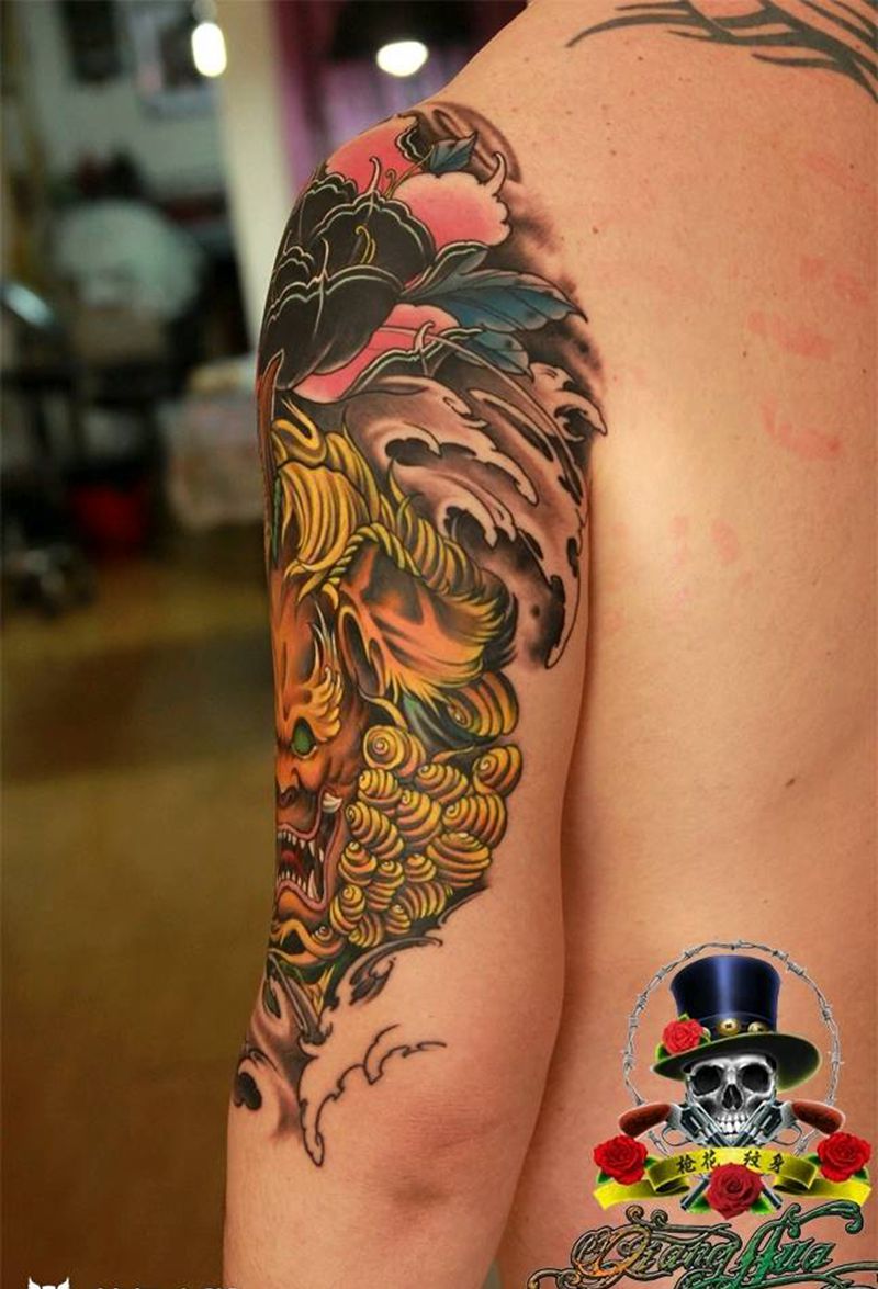 当前位置: 首页 >辽宁省抚顺市纹身店-枪花纹身机构纹身图案>狮子纹身图片_肩部手臂传统动物成品纹身图案