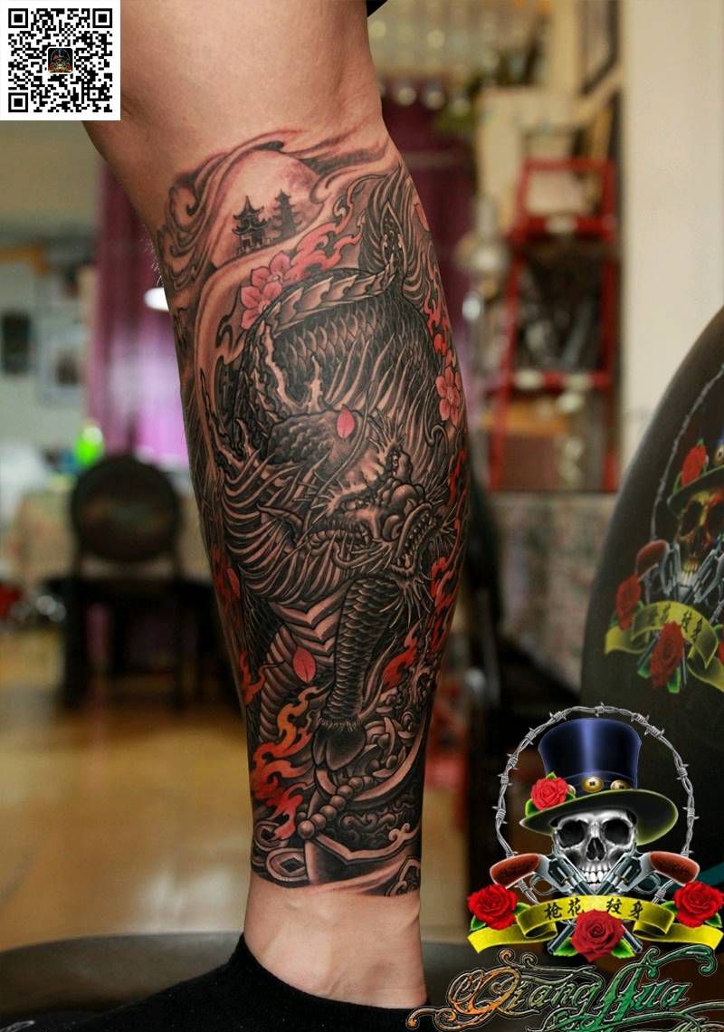 • T网红王老大花腿龙纹身图片_腿部新传统纹身图案