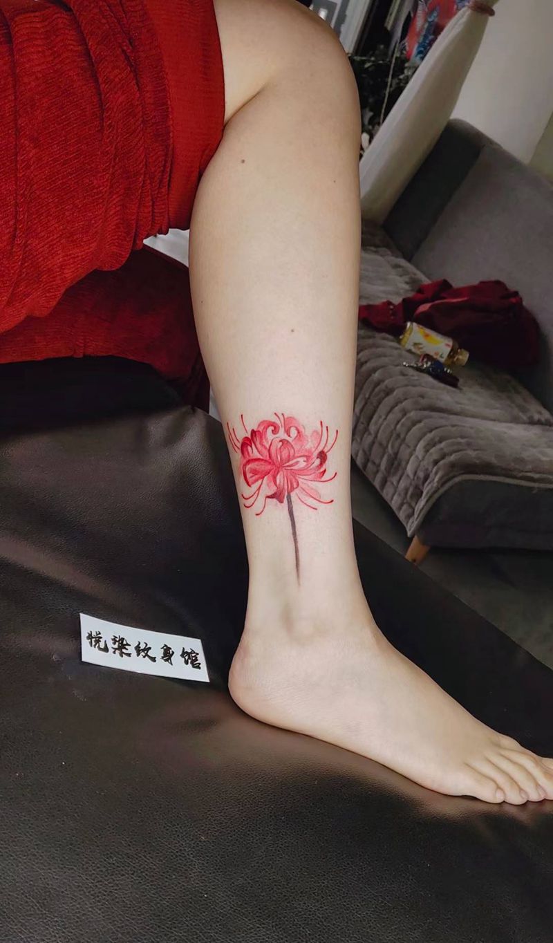 彼岸花纹身图片_腿部水彩水墨彼岸花纹身图案