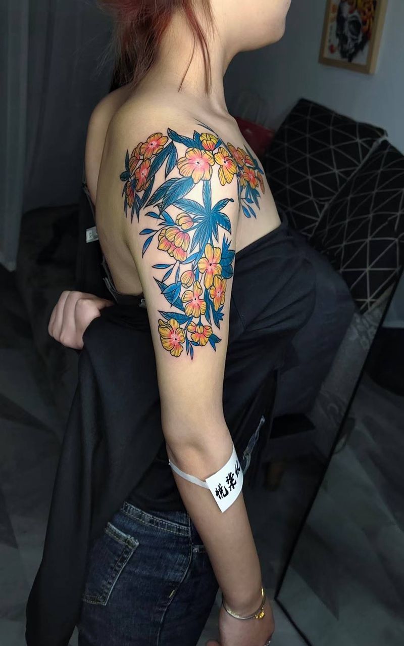 当前位置: 首页 >辽宁省营口市纹身店-悦染纹身馆纹身图案>蓝叶黄花纹身图片_手臂胸部水彩新传统小清新黄花女师纹身图案