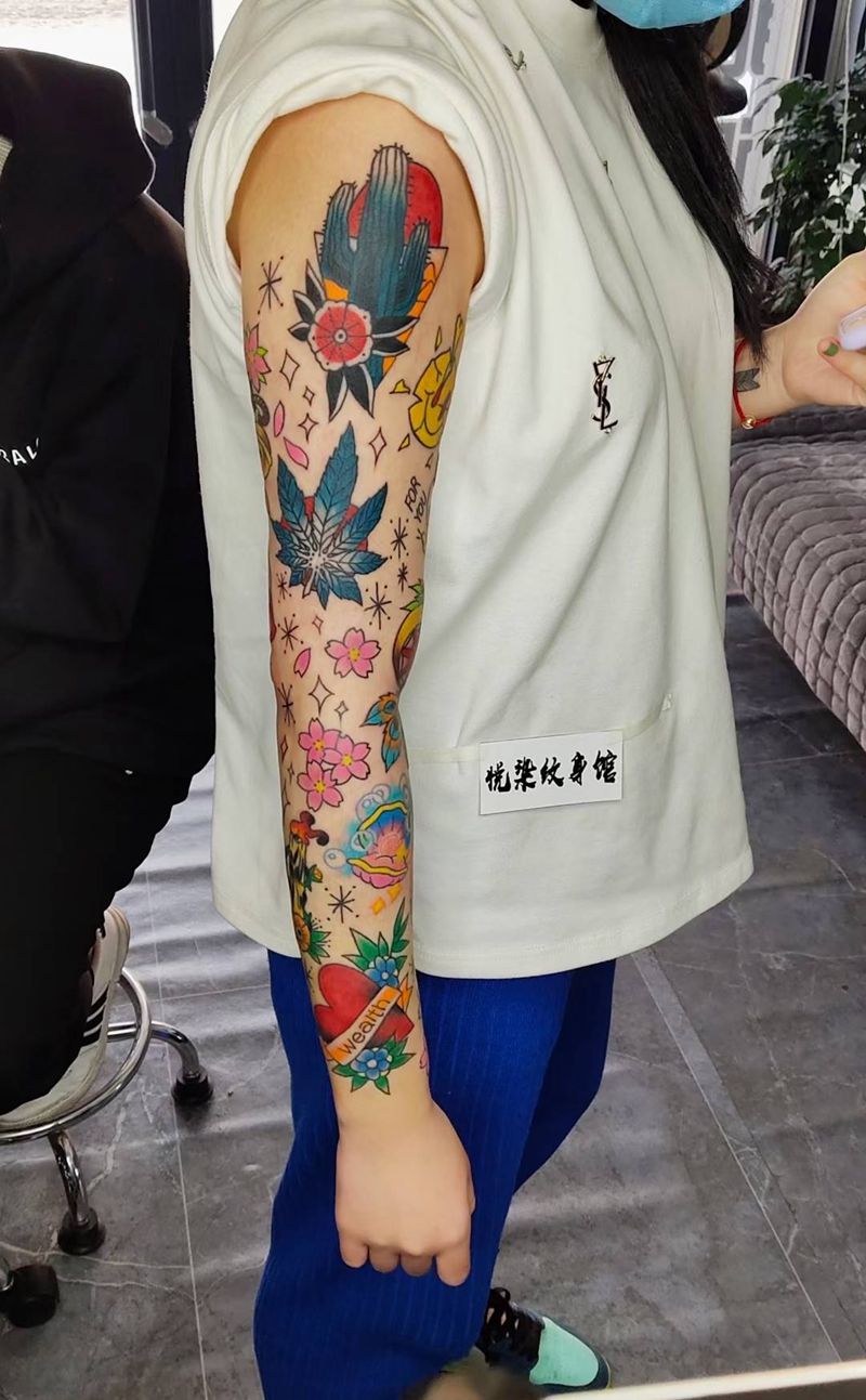 欧美拼接花臂纹身图片_手臂New School欧美花臂拼接花臂彩色小图纹身图案