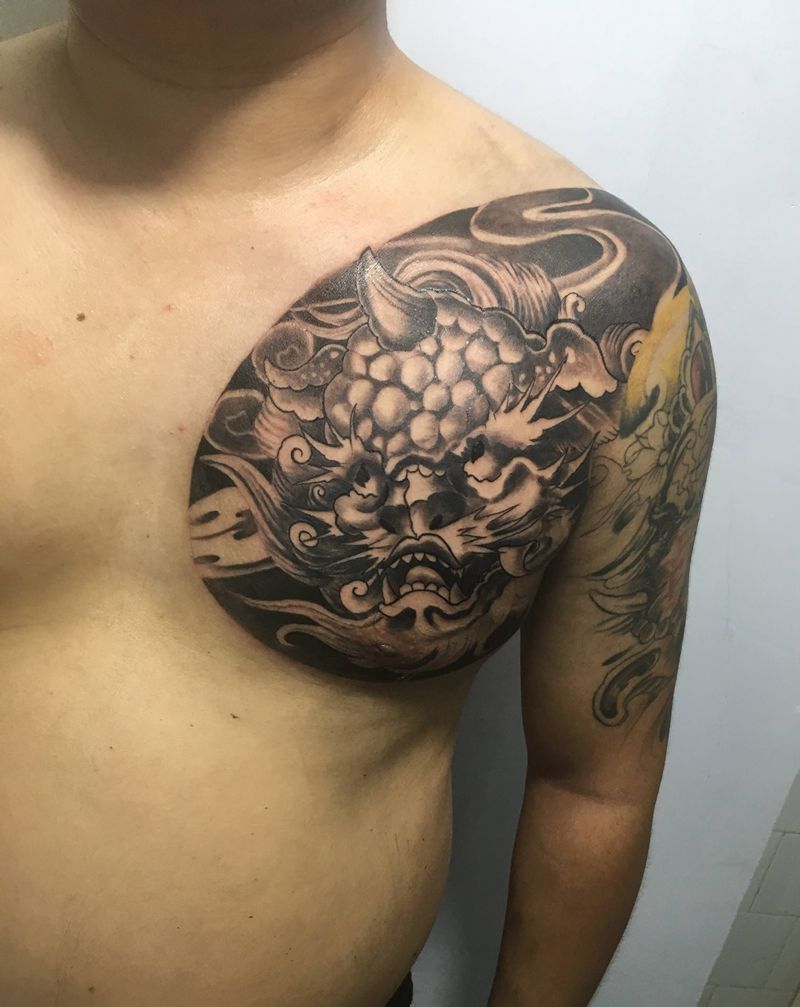当前位置: 首页 >辽宁省盘锦市纹身店-盘锦艺绣堂刺青纹身图案>唐狮纹身图片_胸部纹身图案