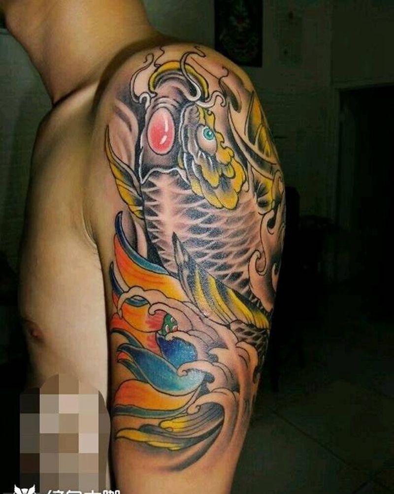 半彩招财鲤鱼纹身图片_手臂新传统鲅鱼圈女师熊岳纹身图案