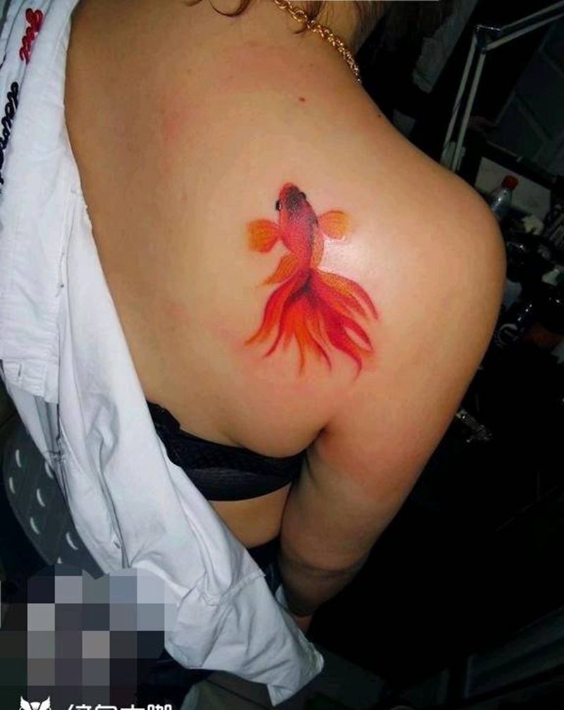 彩色金鱼纹身图片_背部水彩女师鲅鱼圈悦染馆纹身图案