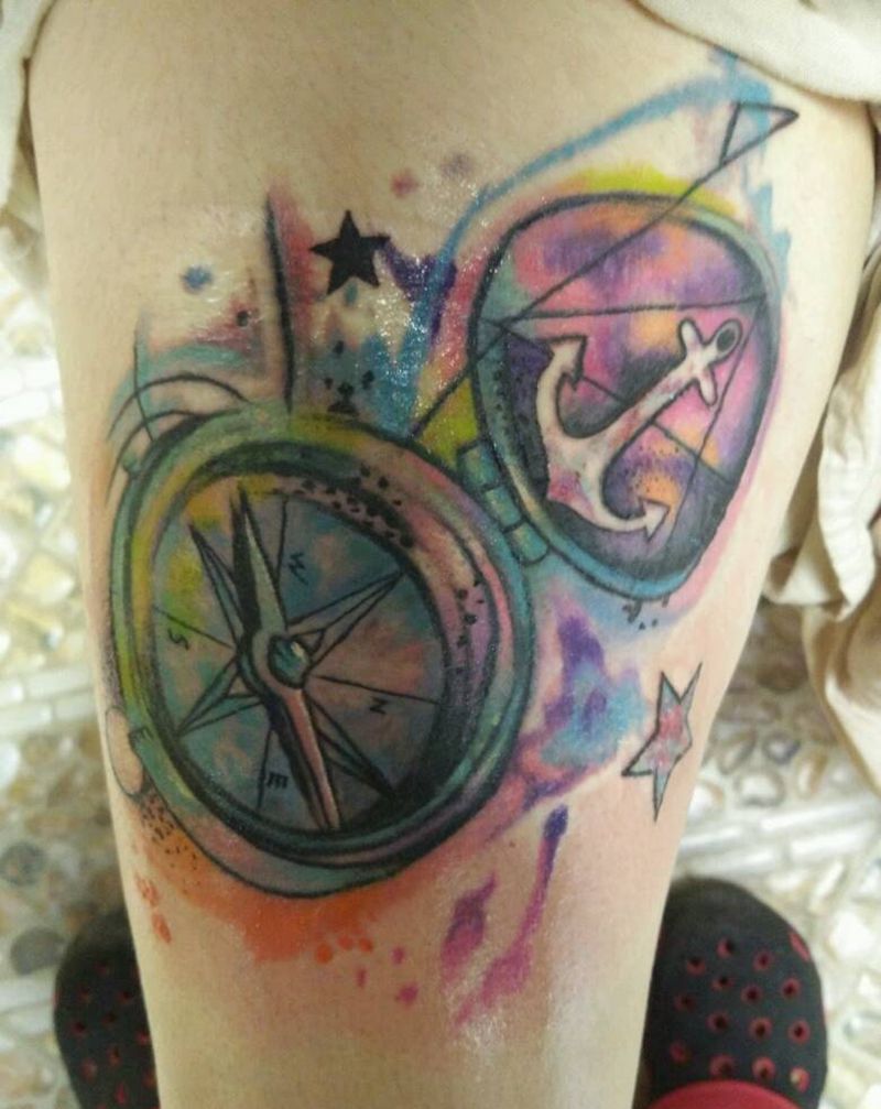 水彩指南针纹身图片_腿部国画几何成品纹身图案