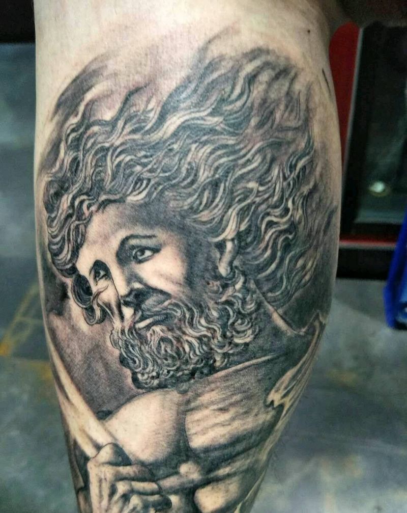 宙斯纹身图片_腿部欧美人物成品纹身图案
