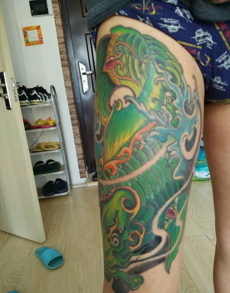 • T网红王老大花腿龙纹身图片_腿部新传统纹身图案