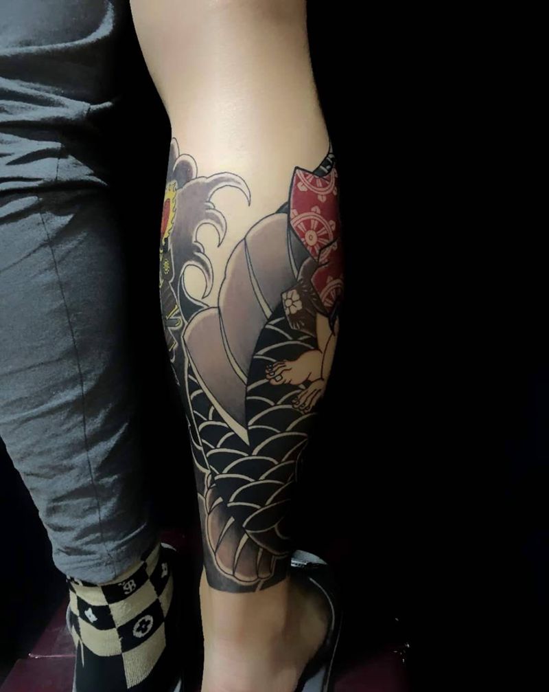 鬼若丸治鲤纹身图片_腿部老传统新传统人物鱼动物纹身图案