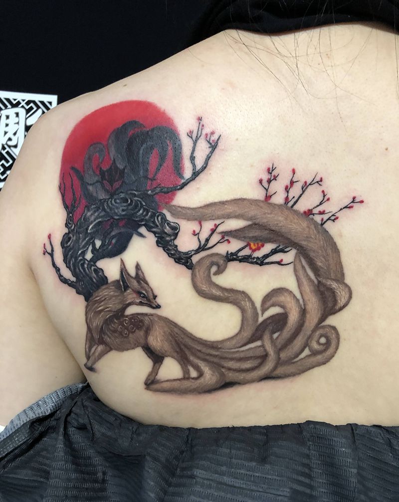 遮盖修改九尾狐纹身图片_肩部背部新传统欧美写实九尾狐纹身图案