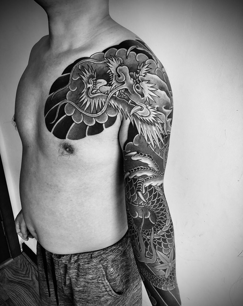 当前位置: 首页 >吉林省长春市纹身店-彫青纹身馆纹身图案>花臂龙纹身图片_手臂胸部老传统龙枫叶火焰纹身图案
