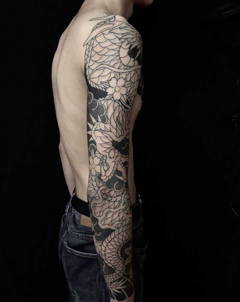 当前位置: 首页 >吉林省长春市纹身店-彫青纹身馆纹身图案>传统花臂半胛龙纹身图片_手臂肩部老传统新传统龙樱花火焰纹身图案