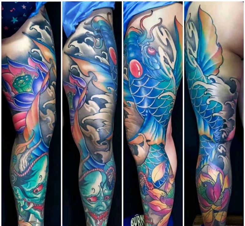 当前位置: 首页 >吉林省长春市纹身店-彫青纹身馆纹身图案>彩色大鲤鱼般若花腿纹身图片