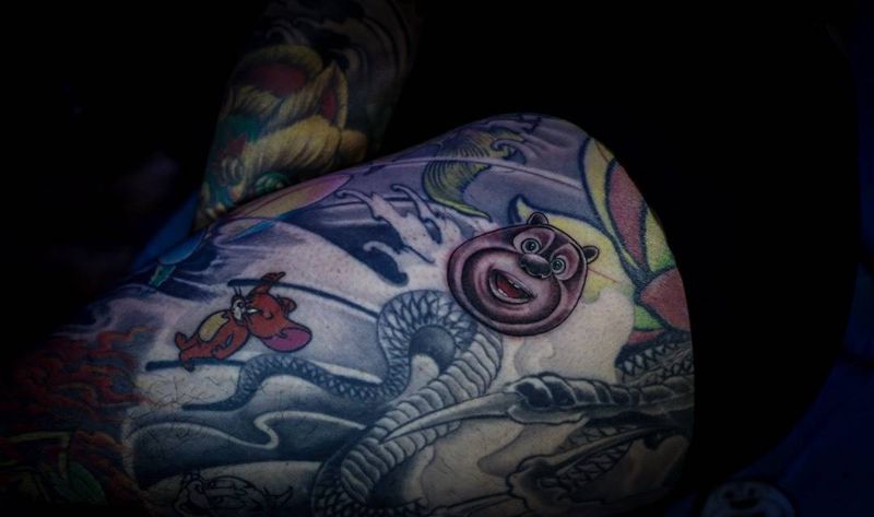 • T包小腿吹火男+阿多福纹身图片_腿部老传统新传统吹火男阿