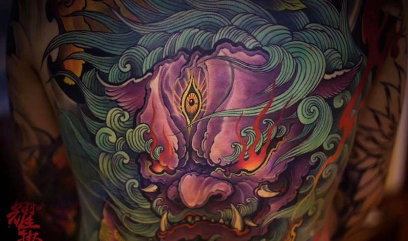 当前位置: 首页 >吉林省长春市纹身店-耀扬刺青纹身图案>祥瑞福狮纹身图片_成品背部传统福狮纹身图案