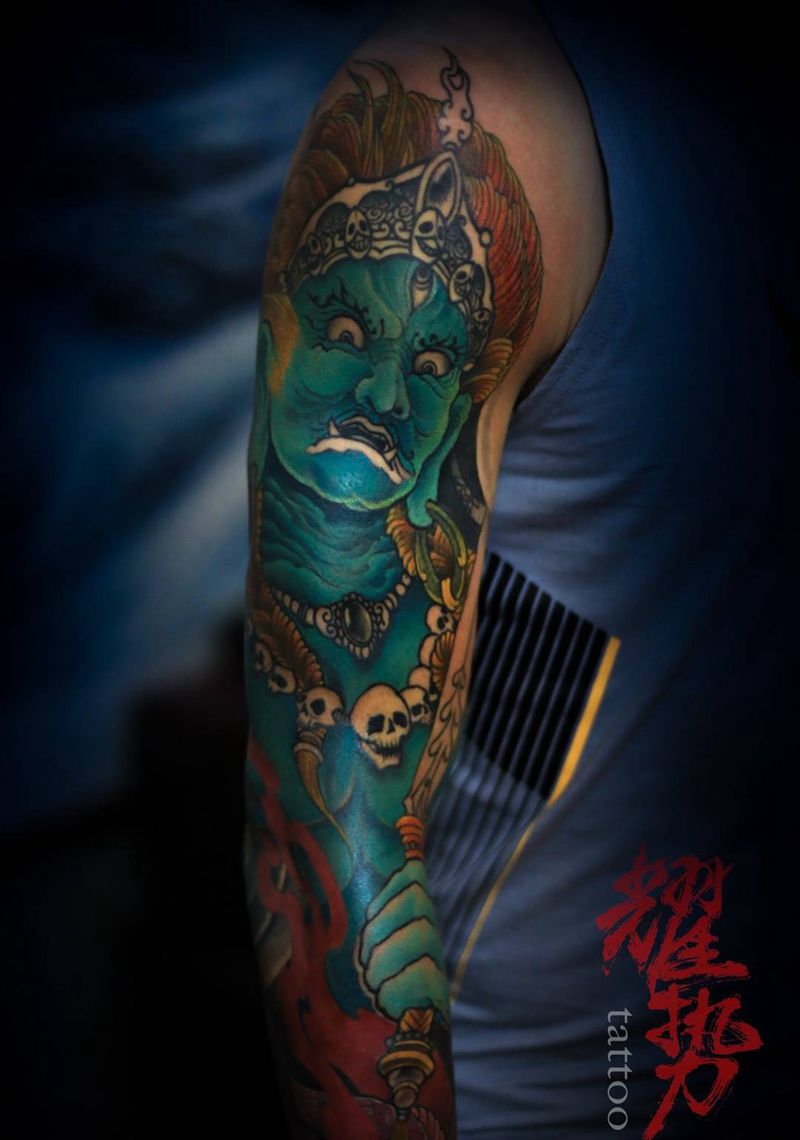 当前位置: 首页 >吉林省长春市纹身店-耀扬刺青纹身图案>花臂 大黑天纹身图片_成品手臂传统肖像人物鬼神宗教原创植物动物纹身图案