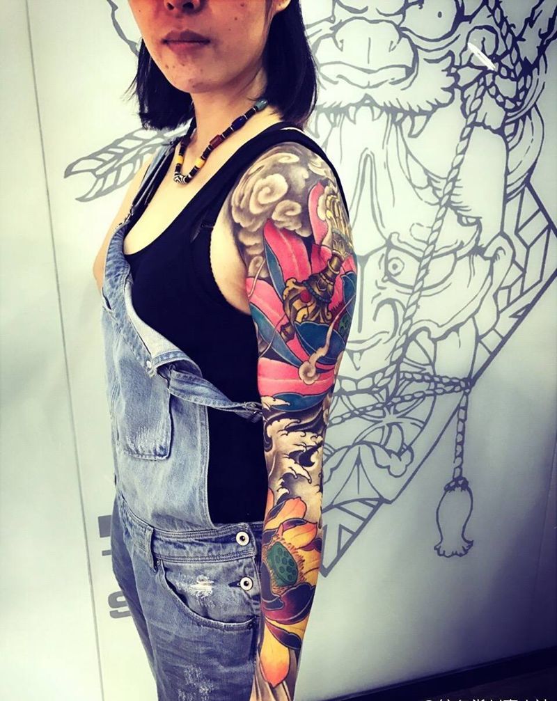 美女莲花花臂纹身图片_成品手臂传统纹身图案