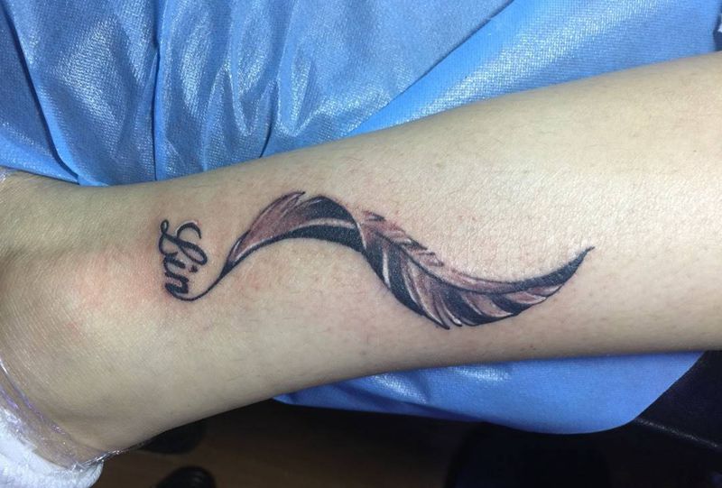 当前位置: 首页 >吉林省长春市纹身店-彫客堂刺青纹身图案>羽毛加英文纹身图片_成品脚部清新纹身图案