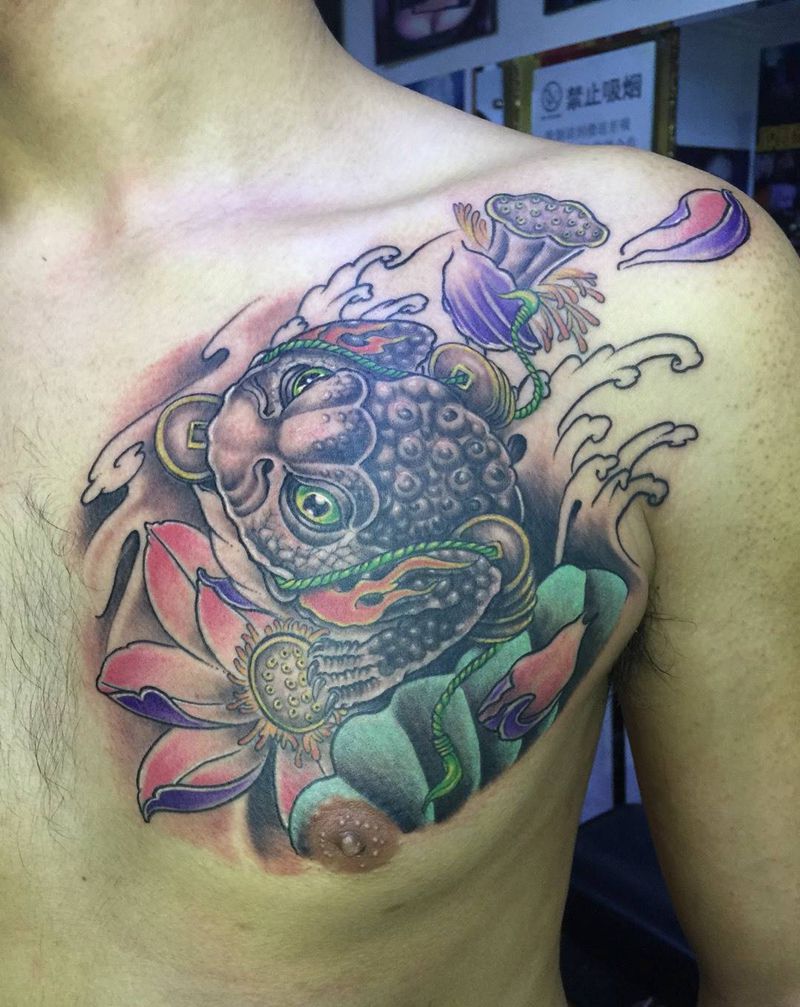 半胛前胸金蟾部分完成纹身图片_胸部传统动物纹身图案