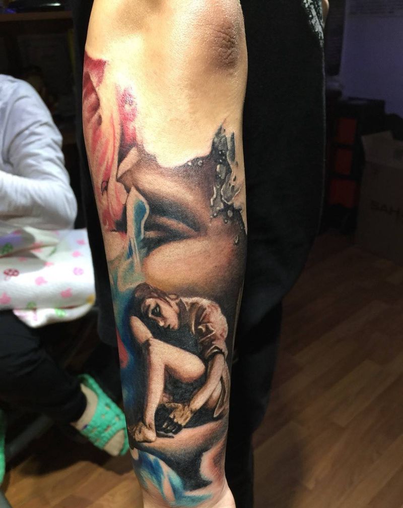 欧美彩色 美女意境 未完成待续纹身图片_手臂欧美写实人物原创纹身图案
