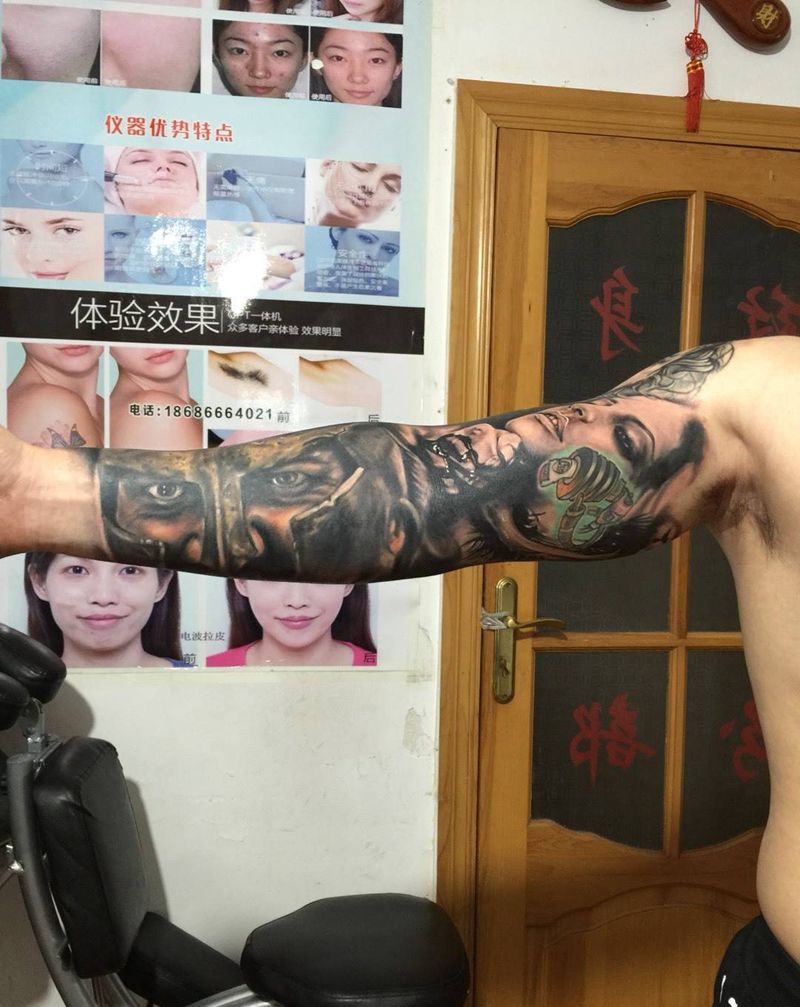 拼接欧美黑灰花臂纹身图片_成品手臂肖像写实原创纹身图案