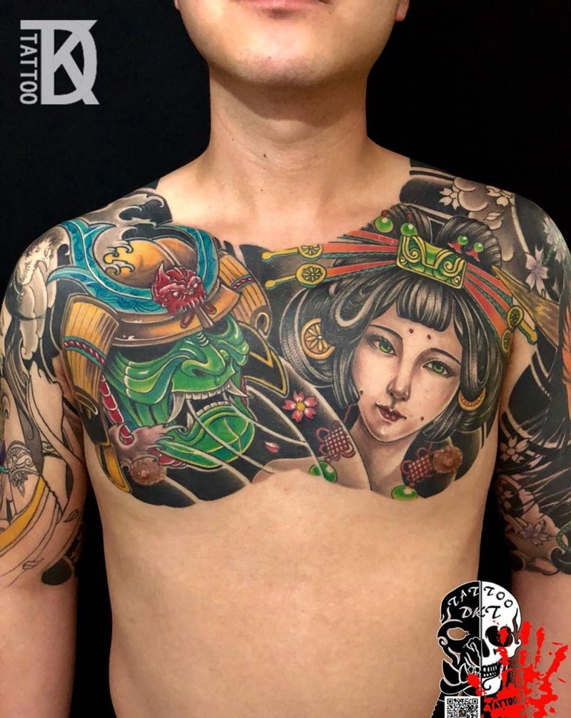 鬼武士 艺妓花胸纹身图片_成品胸部传统原创人物纹身图案
