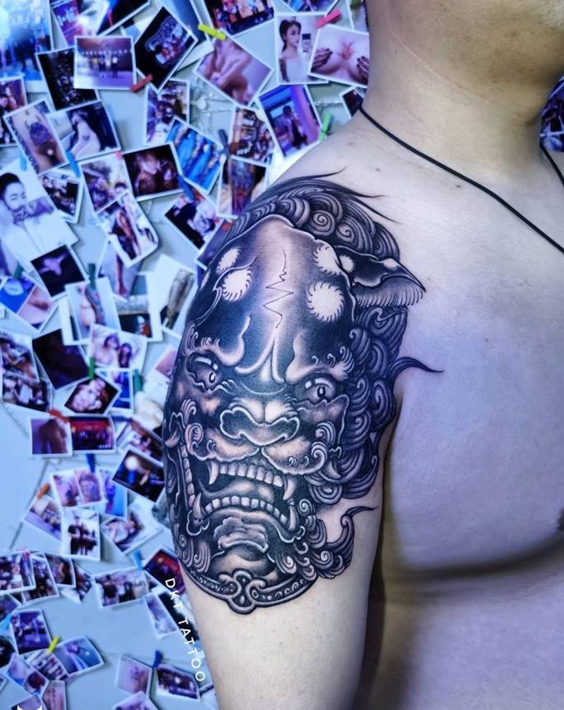 大臂唐狮遮盖作品纹身图片_手臂新传统遮盖纹身图案