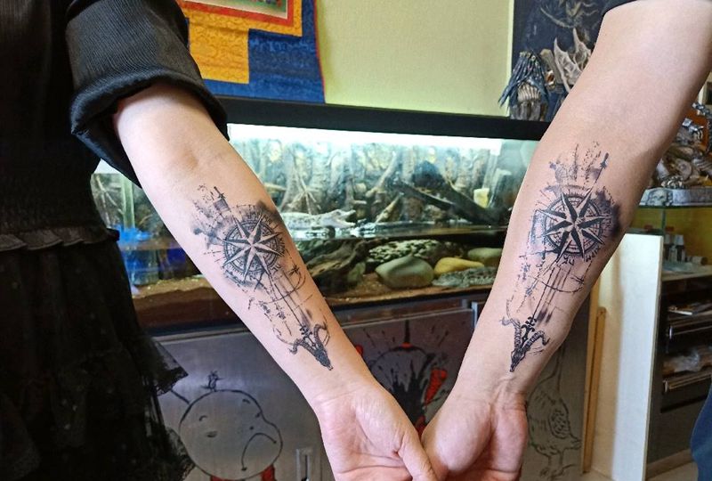 水墨情侣指南针纹身图片_手臂水墨纹身图案