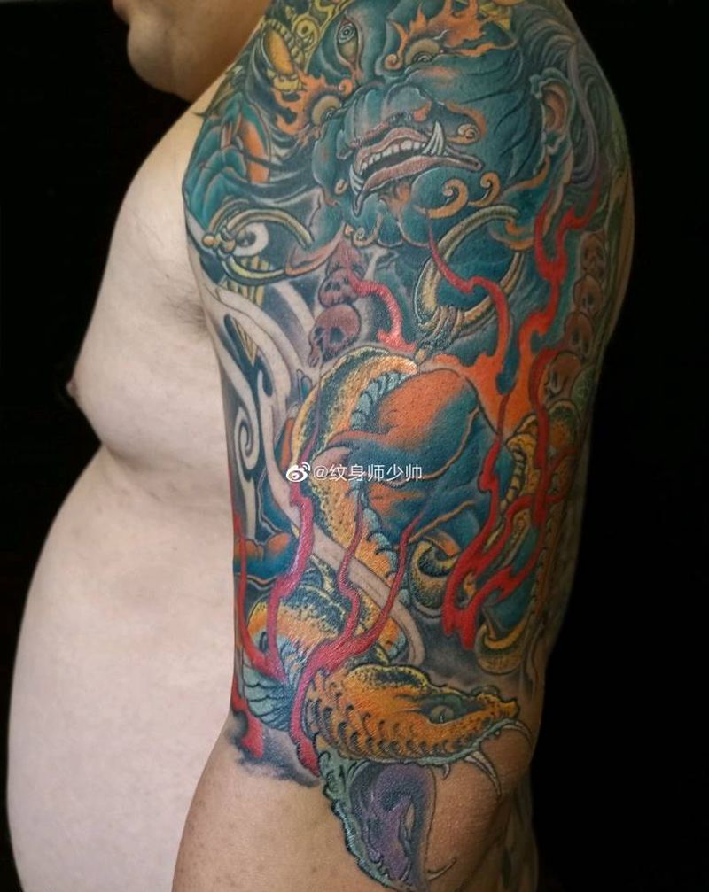• T网红王老大花腿龙纹身图片_腿部新传统纹身图案