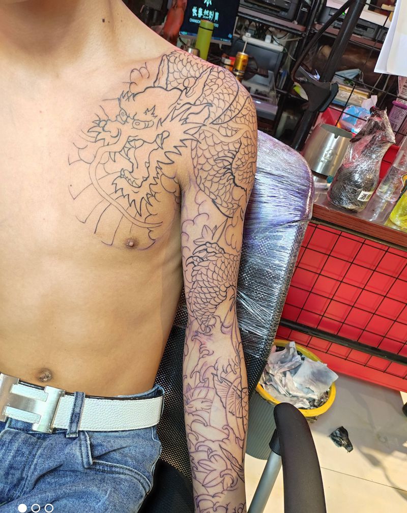 当前位置: 首页 >吉林省长春市纹身店-长春然刺青纹身图案>老传统 龙 鱼 花臂半胛纹身图片_老传统纹身图案