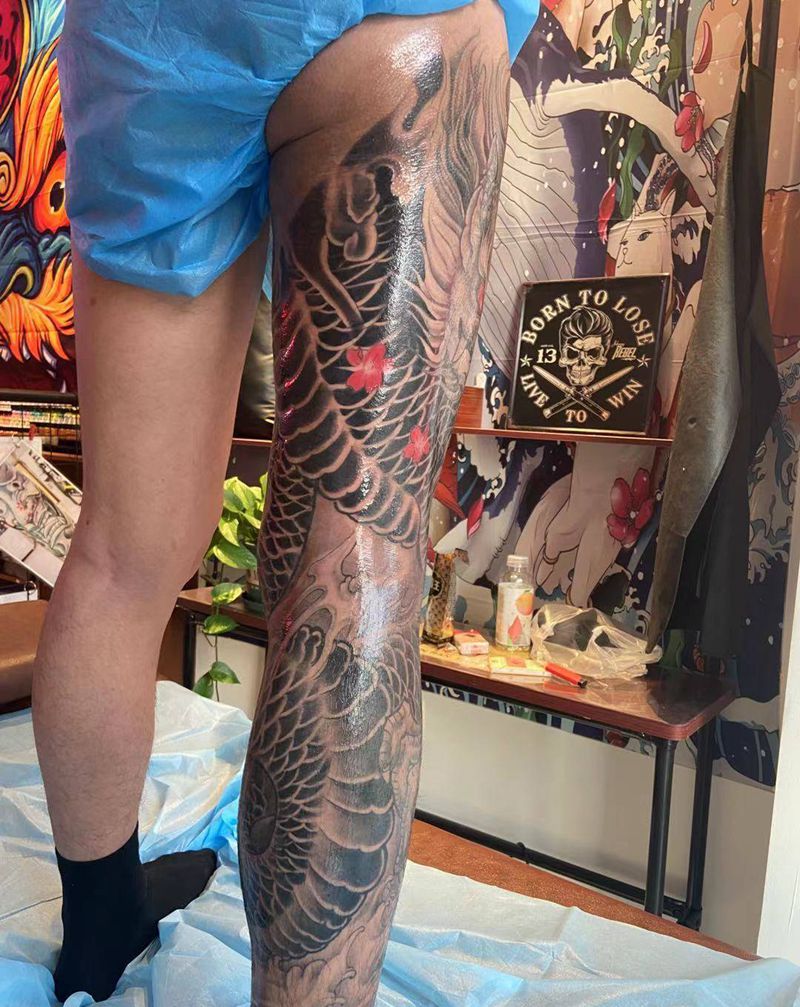 • T网红王老大花腿龙纹身图片_腿部新传统纹身图案