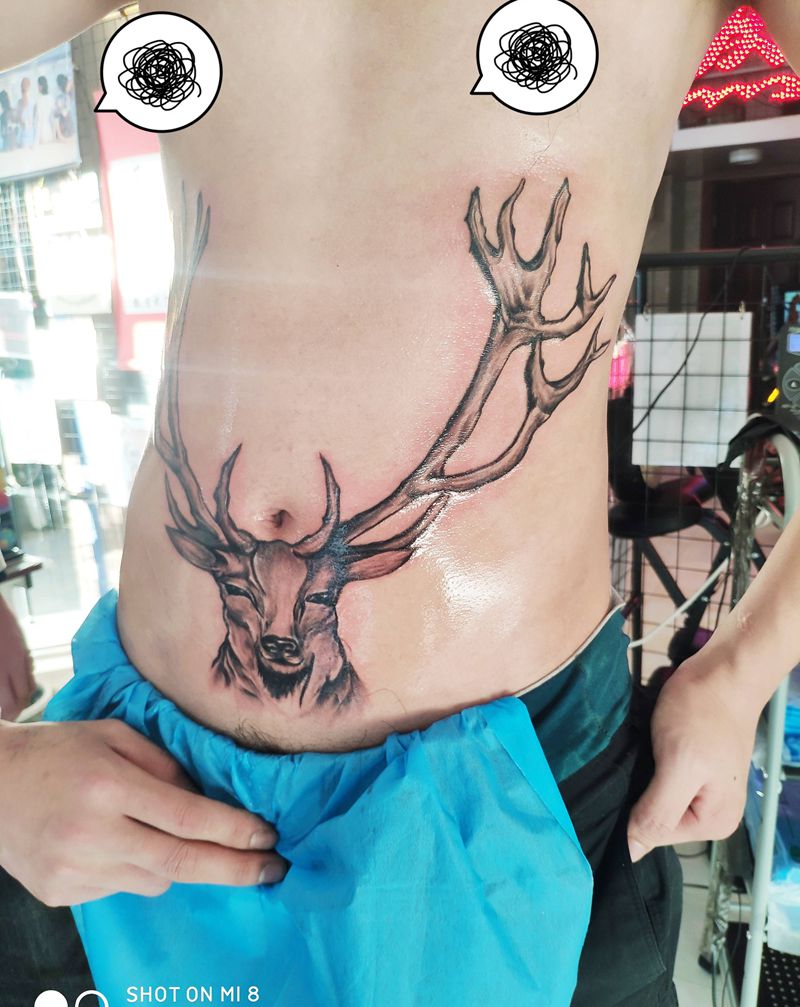 鹿头纹身图片_腹部纹身图案