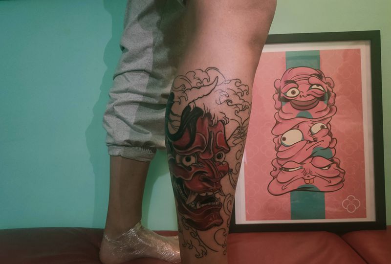 小腿彩色般若(未完待续)纹身图片_腿部新传统般若水纹身图案