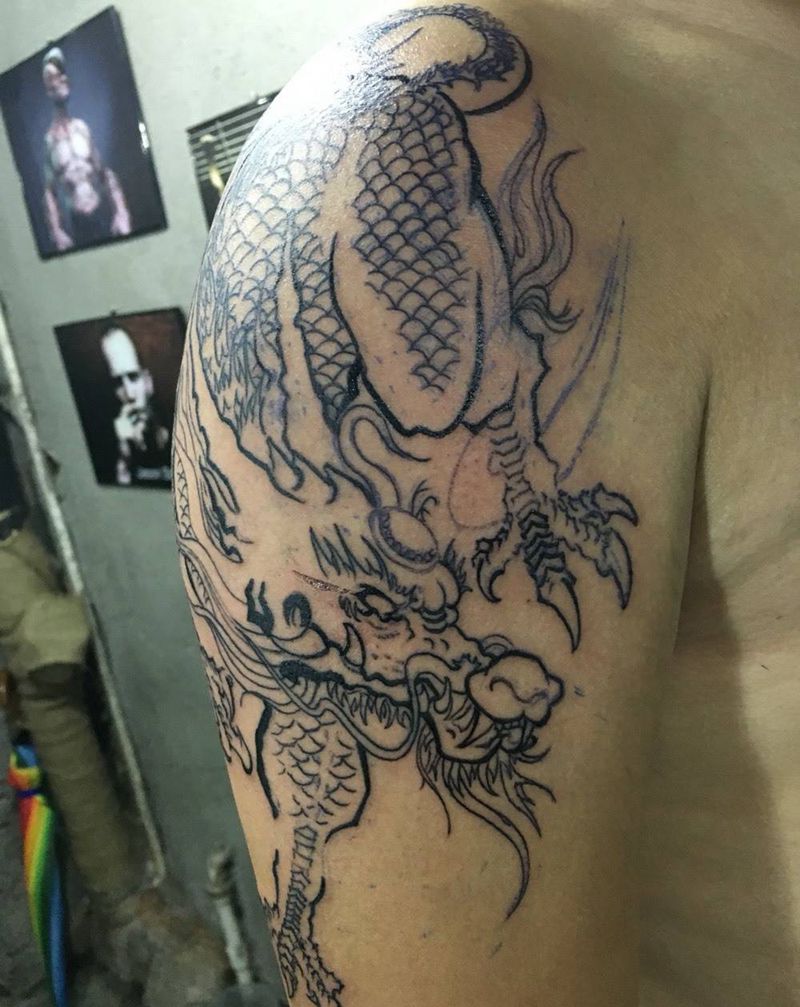 • T网红王老大花腿龙纹身图片_腿部新传统纹身图案