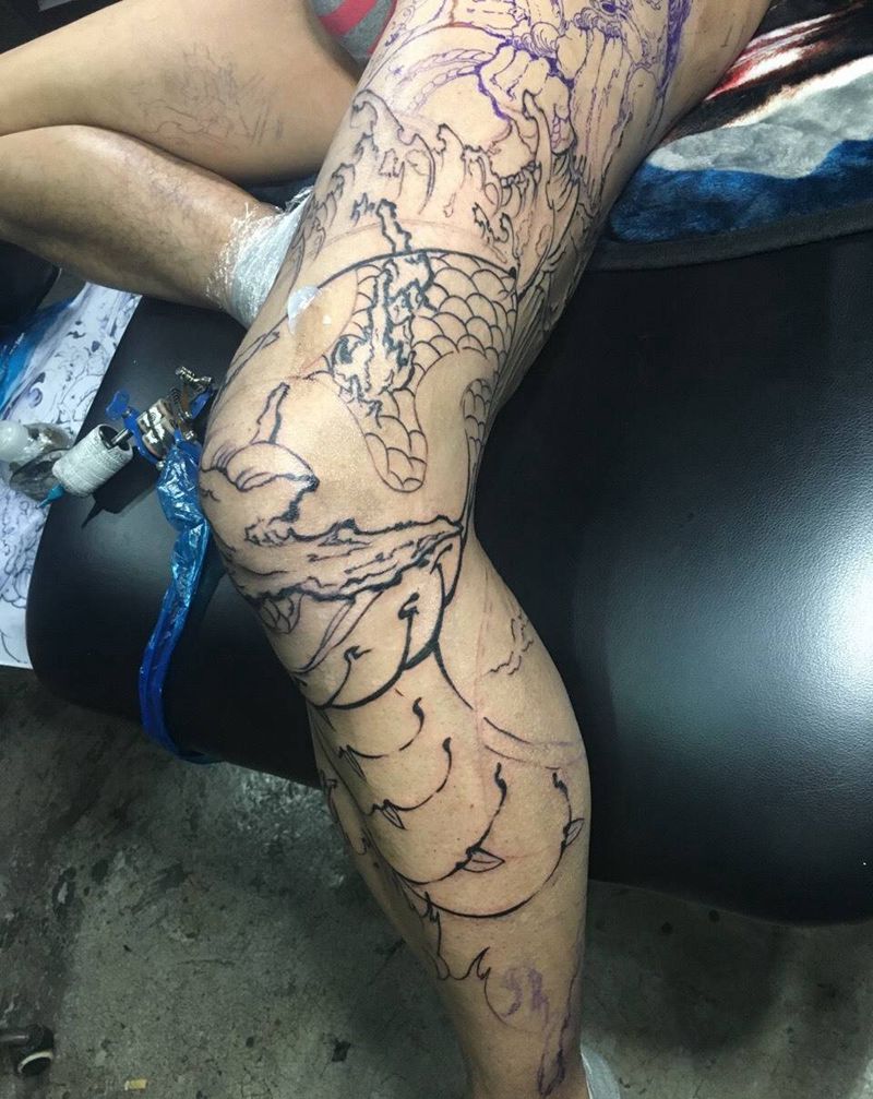 • T网红王老大花腿龙纹身图片_腿部新传统纹身图案