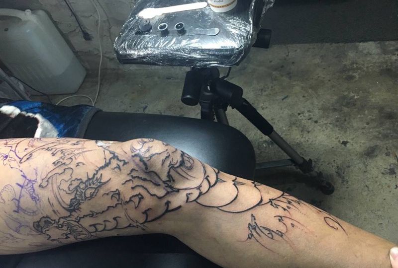 • T网红王老大花腿龙纹身图片_腿部新传统纹身图案