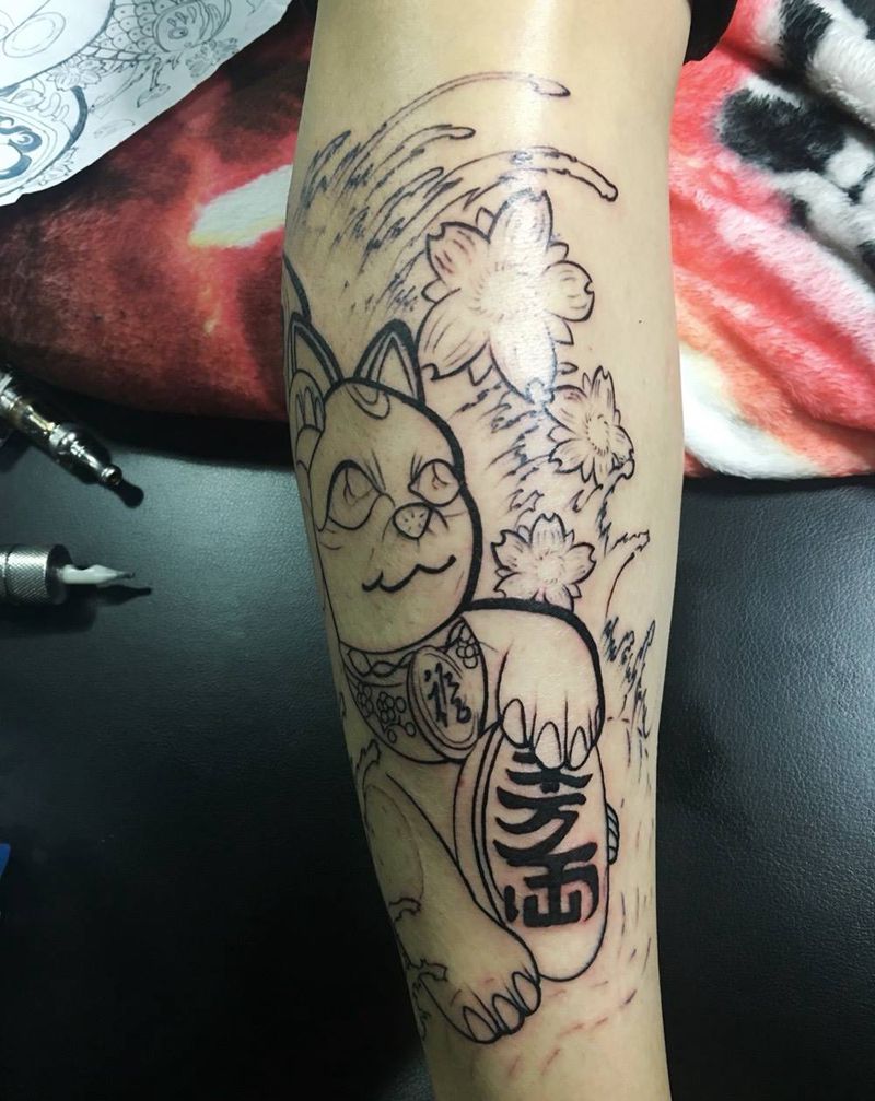招财喵线条结束纹身图片
