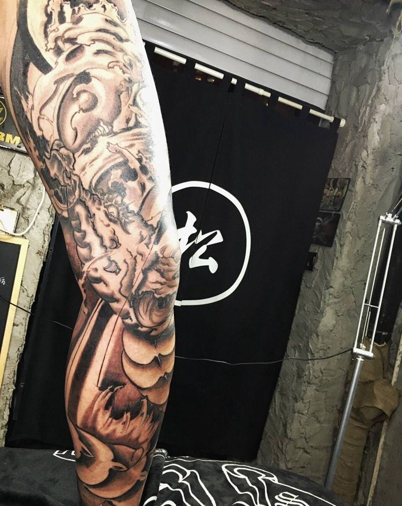 • T网红王老大花腿龙纹身图片_腿部新传统纹身图案