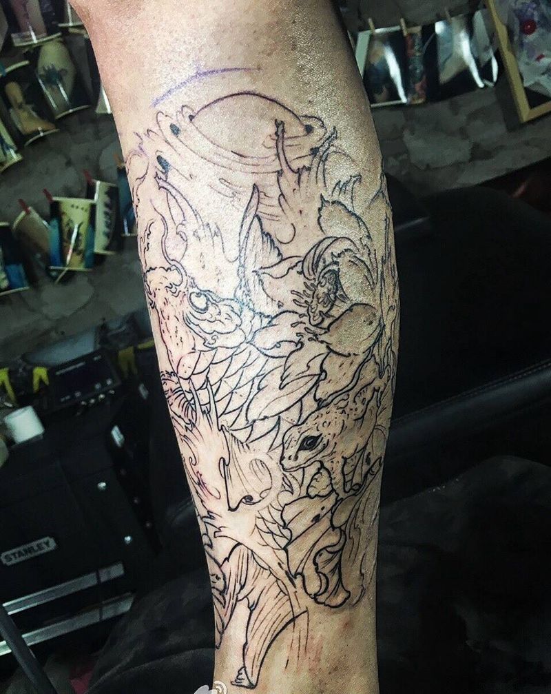 • T网红王老大花腿龙纹身图片_腿部新传统纹身图案